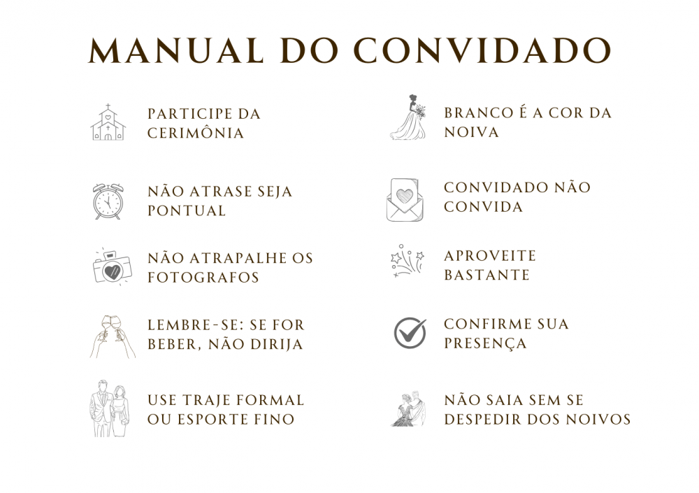 A confirmação de presença será feita diretamente pela nossa assessoria, portanto, não se preocupem, pois a equipe entrará em contato com você até 30 dias antes da data do casamento.